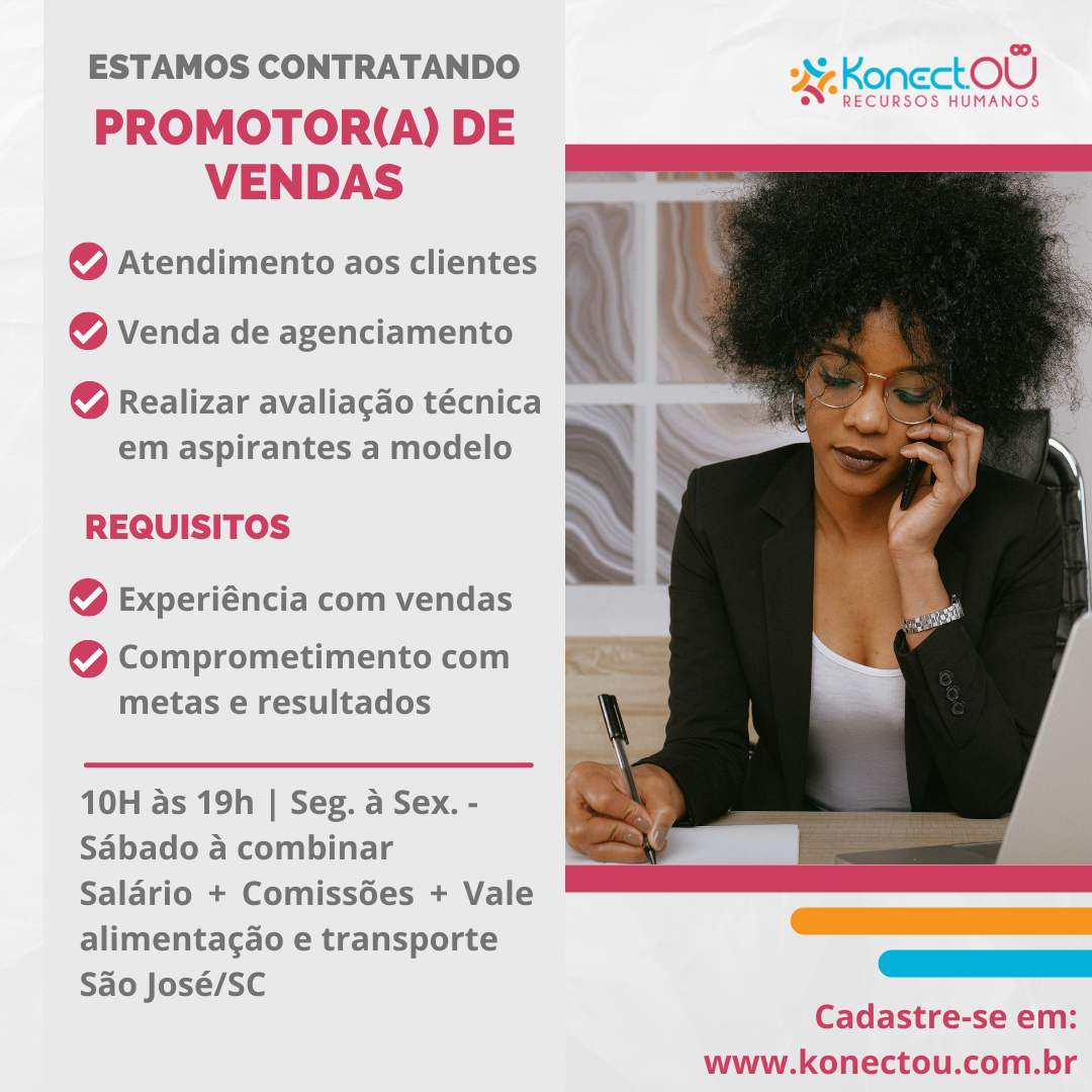IMPORTANTE: Sejam bem vindos ao TRABALHO SC! Somos uma agência de empregos online onde o intuito é somente ajudar pessoas em busca de oportunidade de emprego e empresas que precisam contratar funcionários. Esse site não é responsável por informações repassadas por empresas, outras agências ou representantes de RH. Caso encontre quaisquer informações falsas, avise os administradores da plataforma imediatamente! VAGA DE PROMOTOR(A) DE VENDAS
